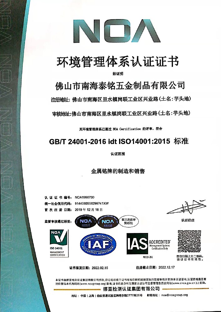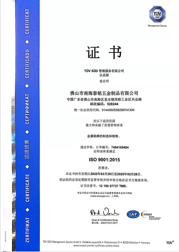 佛山市南海区泰铭五金制品有限公司专业制造各类商标铭牌,从设计——开模——冲压——压铸——电镀——阳极氧化——滴胶——拉丝——喷漆——高光等30多种工艺,公司占地面积达两万平方米,员工500余人,其中高级工程师5名,研发人员10名。主要产品为汽车、灯饰、机车、电机、五金、烤炉、家具等配件,客户以美国、加拿大、日本、澳大利亚、丹麦、西班牙等知名海外厂商为主。